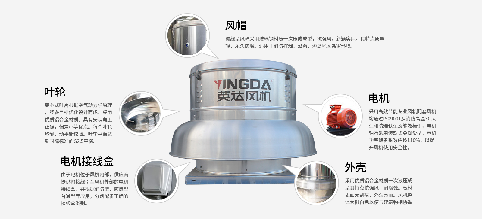 ● 鋁制葉輪; ● 電機; ● 鋁制機殼(風筒、集流器、支架);