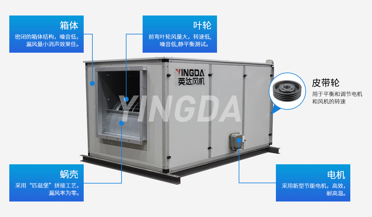 英達風機蝸殼采用流線型雙進風結構,“匹茲堡”拼接工藝,漏風率為零;雙側板一次成型,精度高,減小裝配后尺寸誤差;葉片一次沖壓 成型,專門夾具確保葉片安裝精確定位。
